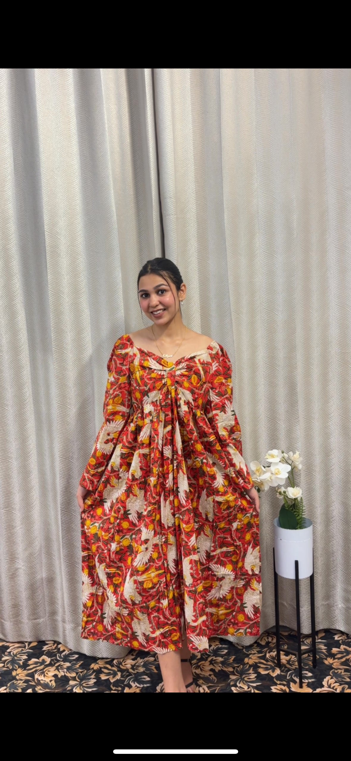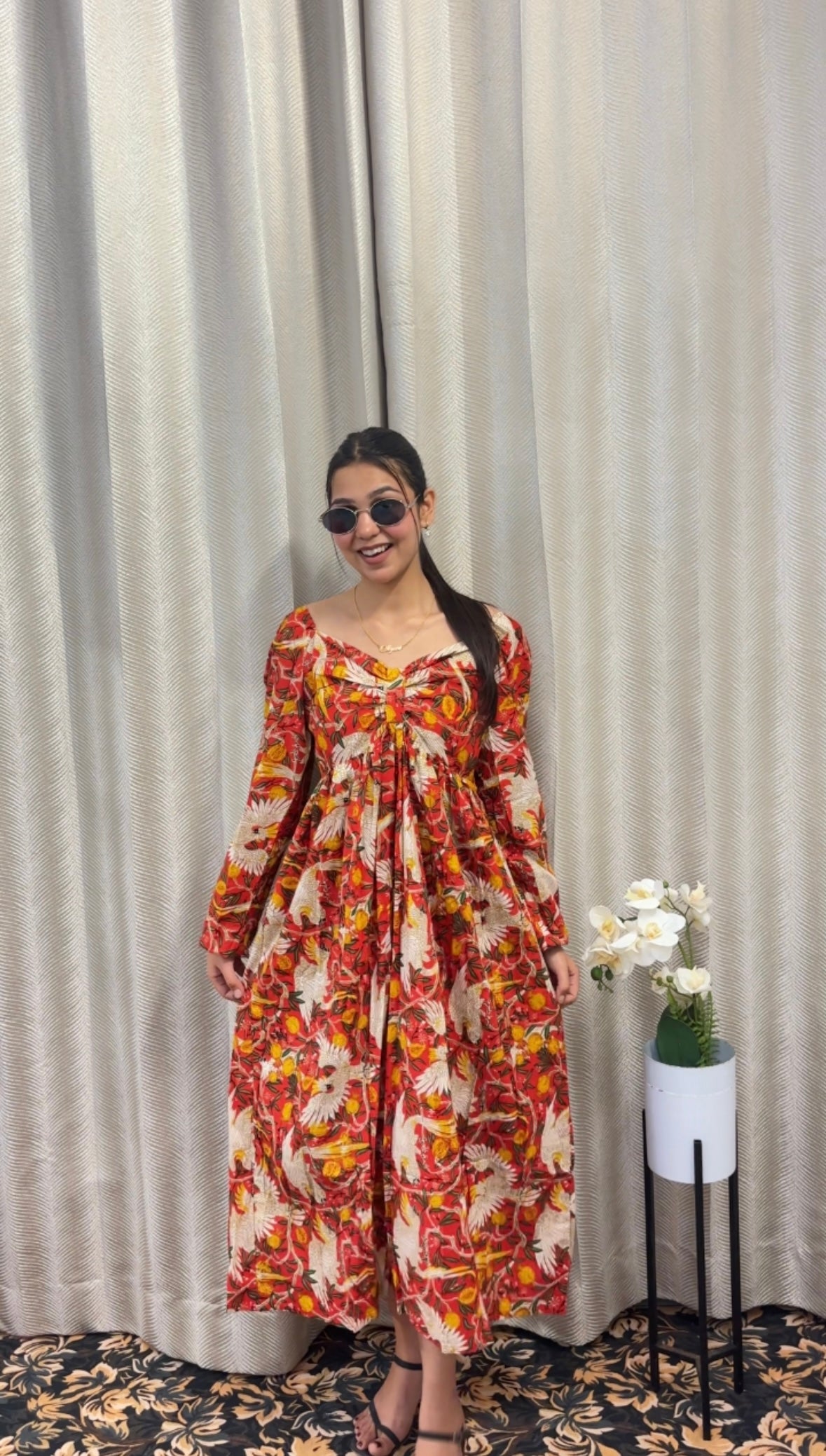 A vibrant floral dress with a flowy silhouette, designed to bring effortless elegance and charm to your summer wardrobe.